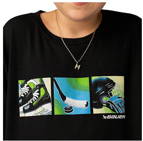 La Bauer Graphic Tee 1 T-Shirt Junior nera porta uno stile ispirato all'hockey nella vita di tutti i giorni dei giovani giocatori. Con la sua grafica ispirata all'hockey posizionata al centro del petto, offre un look sportivo e unisce un design casual a un comfort piacevole.